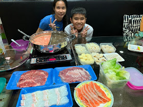 Today is Lunar New Year eve and we had setup a hot pot with two separate soup bases for our reunion dinner. Jerlene and Javier were getting ready for the dinner.